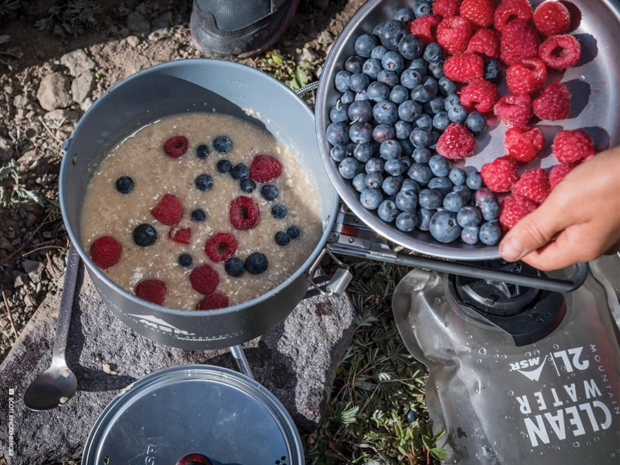 The design features MSR’s Fusion® nonstick ceramic coating on both the 2.5L Sauce Pot and 8” Skillet for improved cooking performance. Radiant burner technology features a glove-friendly simmer-boil control for versatile meal options while a pressure regulator allows for consistent performance in colder weather. Both saucepot and 8″ skillet lock to the burner with their enclosed, heat-capturing rings offering greater efficiency when simmering and cooking.