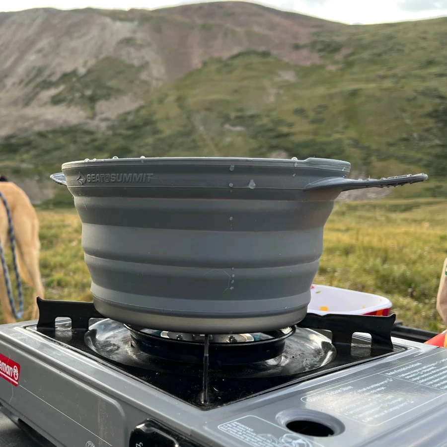 The 2.8L X-Pot from Sea to Summit features a silicone walled construction with 5 folding segments that fold down to a backpacking friendly 45mm. The aluminium base offers a fast boil time while a stainless steel ring embedded in the rim delivers cooking stability for stirring and lifting.
